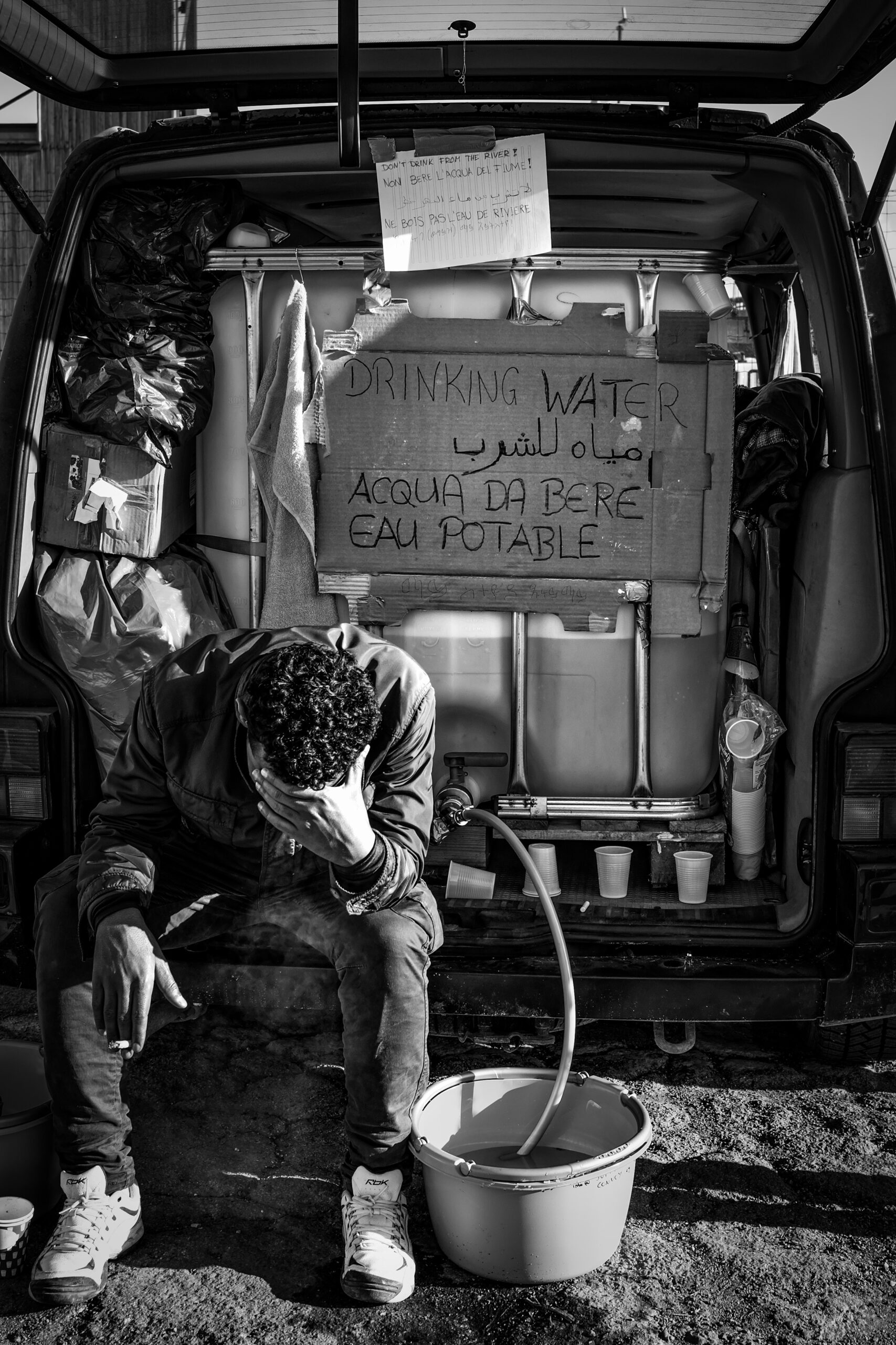 “The XX Miles Hotel” è un progetto a lungo termine nato come forma di attivismo per sostenere i collettivi di volontari attivi al confine italo-francese. Esplora la realtà dei migranti bloccati a Ventimiglia attraverso un contrasto incisivo tra immagini e testi, offrendo uno sguardo sarcastico e critico sulla dura vita di chi attende di attraversare un confine interno all’Europa, chiuso nel 2015 dopo vari attacchi terroristici, tra cui quello del Bataclan. Il progetto copre il periodo dal 2018 al 2020, quando molte persone in transito sceglievano di rifiutare l’accoglienza ufficiale per vivere in un campo autogestito sulle rive del fiume Roja. Qui, sotto un viadotto autostradale, i volontari offrivano servizi essenziali come acqua potabile, cibo, vestiti e ricarica per i telefoni, l’unico contatto con la loro casa e i loro affetti. Nonostante le condizioni umanitarie estreme, il campo offriva ai migranti l’indipendenza di proseguire il viaggio e la dignità di prendere decisioni sulla propria vita. L’accoglienza diventa così un atto di resistenza e umanità in un contesto di esclusione e sorveglianza.
